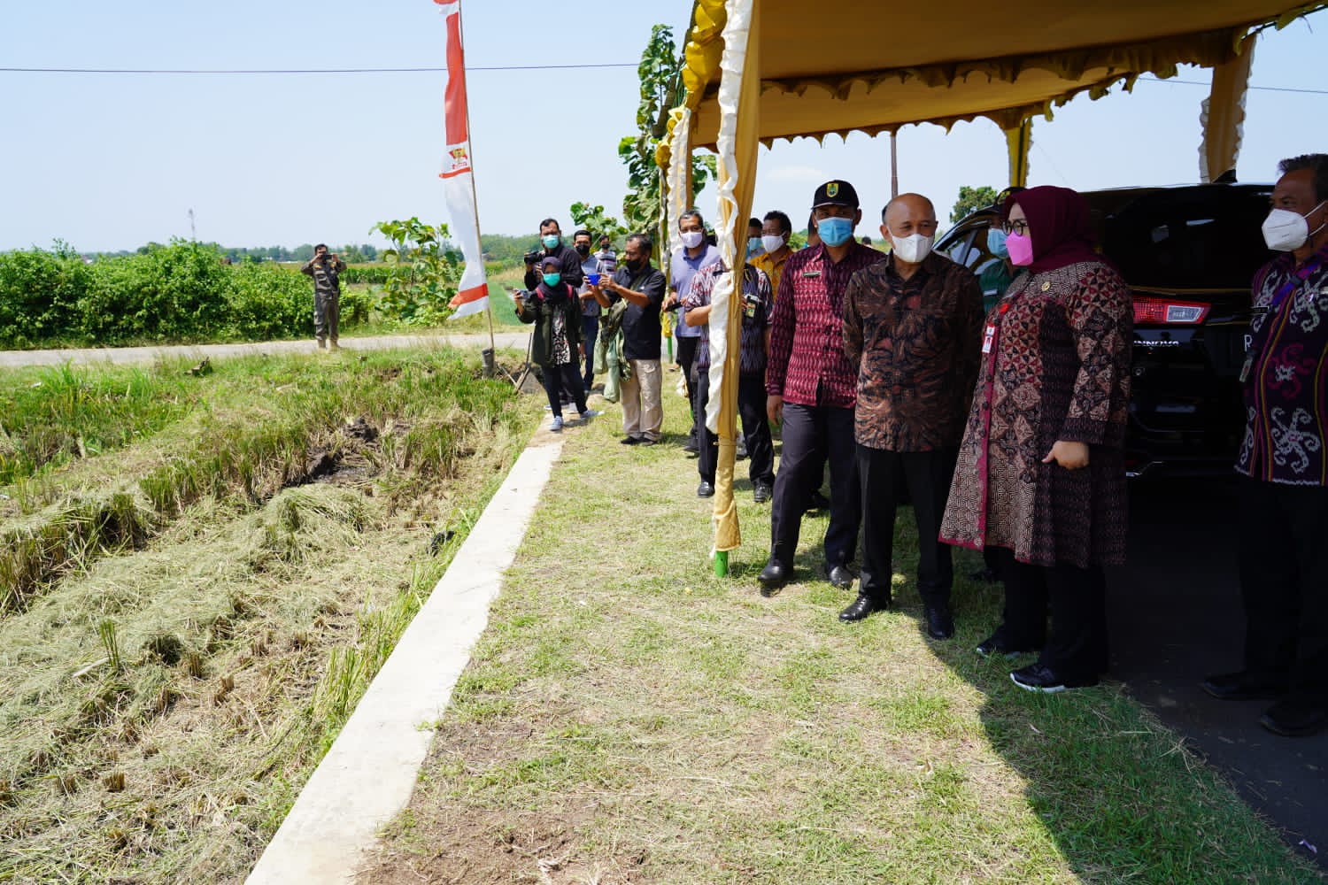 Menteri Koperasi dan UKM Teten Masduki didampingi Bupati Sragen, Kusdinar Untung Yuni Sukowati saat meninjau lahan untuk pembangunan factory sharing di Sragen,Jawa Tengah.