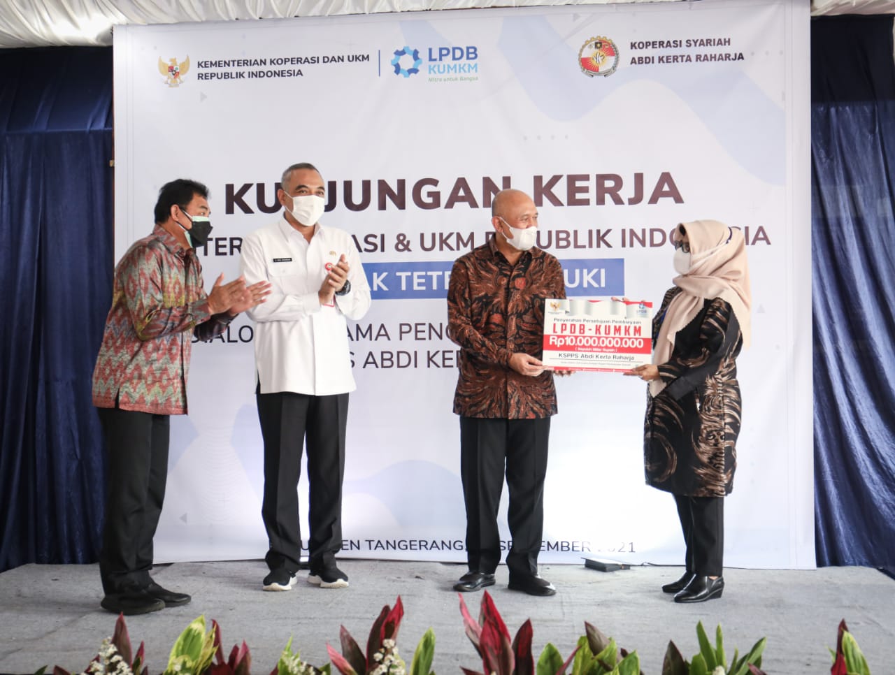 Menteri Koperasi dan UKM, Teten Masduki didampingi Bupati Tangerang, Ahmed Zaki dan Dirut LPDB dalam acara penyerahan bantuan permodalan dari LPDB-KUMKM sebesar Rp 10 miliar.