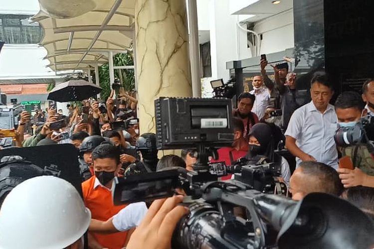Ferdy Sambo yang memakai rompi tahanan berwarna merah Kejagung, keluar dari gedung Jampidum Kejagung sambil dikawal ketat personel Brimob masuk ke dalam kendaraan taktis (rantis).