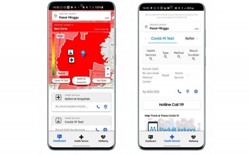 Samsung C-Safe akan menampilkan informasi tingkat risiko penyebaran covid-19, beserta daftar sejumlah rumah sakit rujukan dan fasilitas kesehatan yang menyediakan tes.